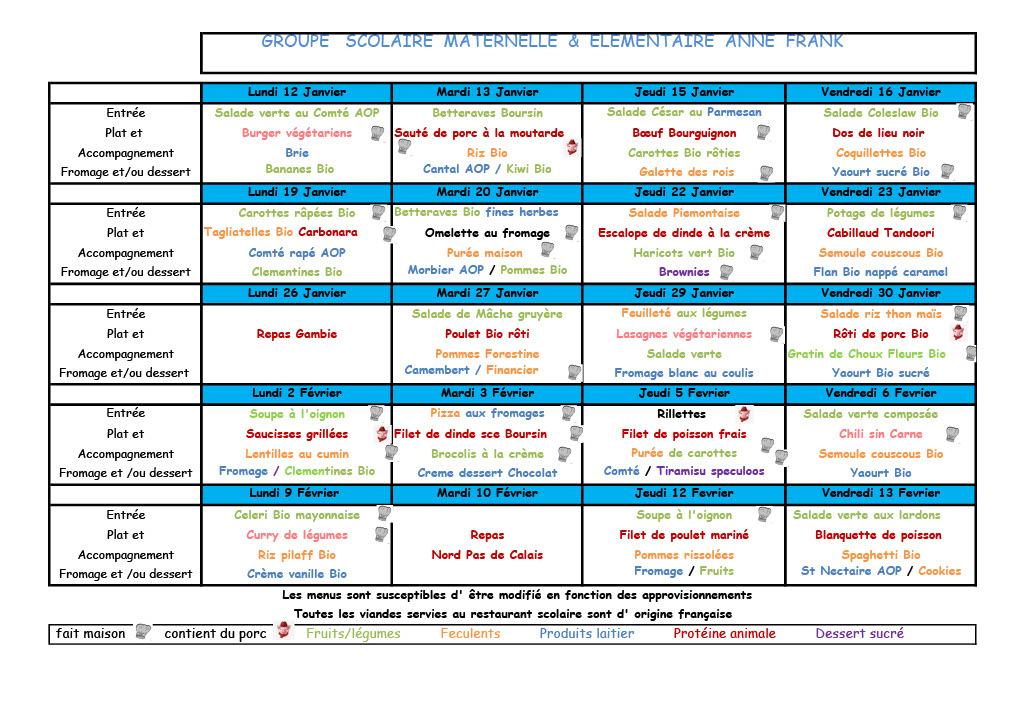 Quotidiennement, le restaurant scolaire propose des repas variés et équilibrés qui correspondent au plus près des recommandations du GEMRCN (Groupe d’étude des marchés de restauration collective et nutrition).