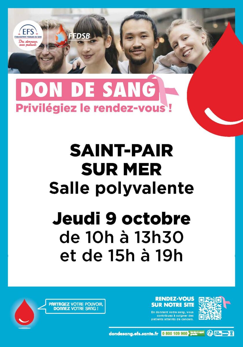 • Jeudi 9 octobre de 10h à 13h30 et de 15h à 19h à Salle Polyvalente Michel Fraboulet de SAINT-PAIR-SUR-MER