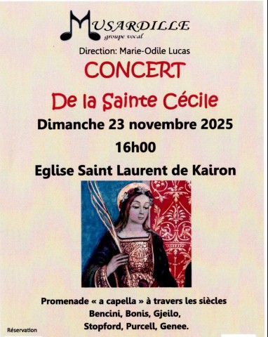 Concert église Saint Laurent – Concert de la Sainte Cécile – Dimanche 23 novembre à 16h Le groupe vocal « Musardille » propose un concert à l’église Saint Laurent de Kairon. Tarif : 10€ – gratuit moins de 12 ans. Skip back to main navigation