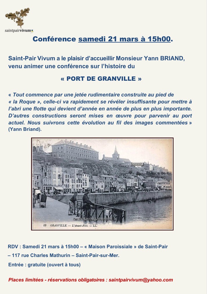 Conférence de Yann BRIAND « Port de Granville » – samedi 21 mars à 15h – Maison paroissiale de Saint-Pair