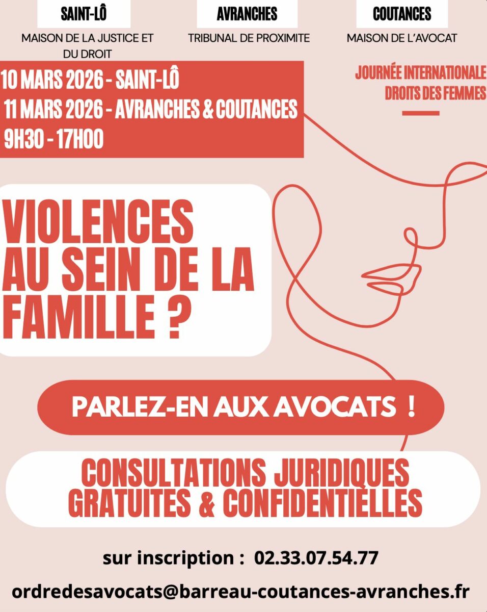 À l’occasion de la Journée internationale des droits des femmes, des consultations juridiques gratuites et confidentielles sont organisées les 10 et 11 mars 2026 dans plusieurs villes de la Manche pour accompagner les personnes confrontées à des violences au sein de la famille.