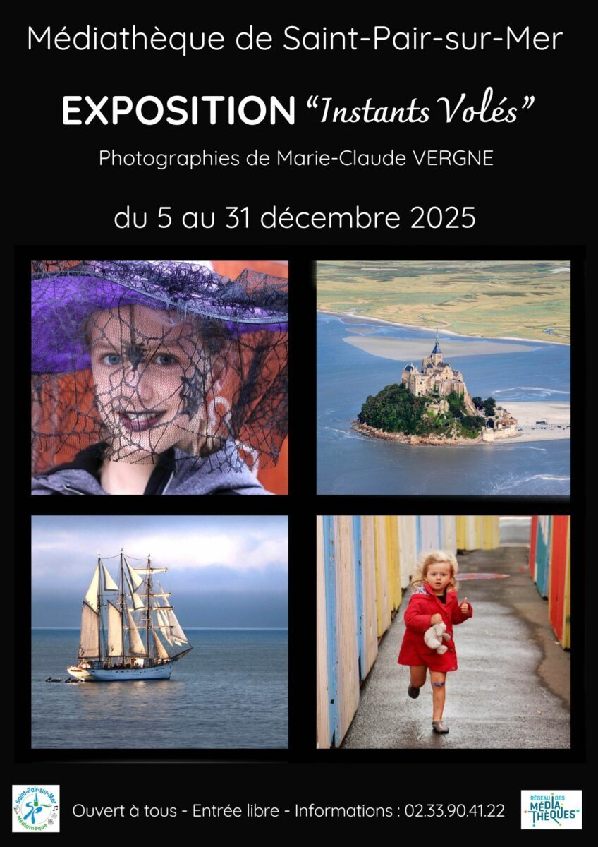 Chaque année en décembre, la médiathèque met en valeur le travail d’un photographe amateur. Cette année, venez découvrir l’exposition « Instants Volés » de Marie-Claude Vergne, photographe passionnée qui porte un regard singulier sur Saint-Pair-sur-Mer et ses environs. Elle capture aussi bien des paysages lors de prises de vue aériennes, que des portraits pris sur le vif, révélant ainsi l’authenticité du territoire et de ses habitants.