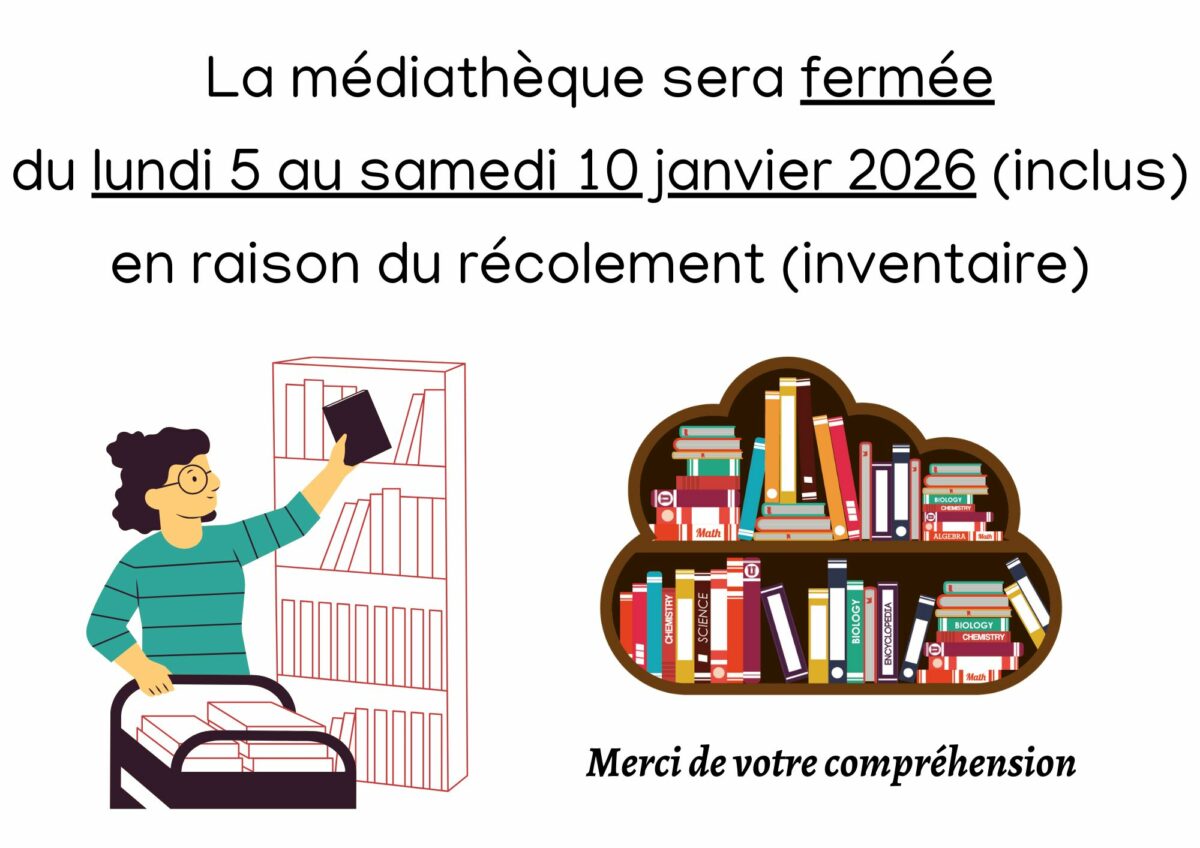 Fermeture de la médiathèque pour récolementLa médiathèque sera fermé pour récolement du lundi 5 au samedi 10 janvier (inclus) pour inventaire. Skip back to main navigation