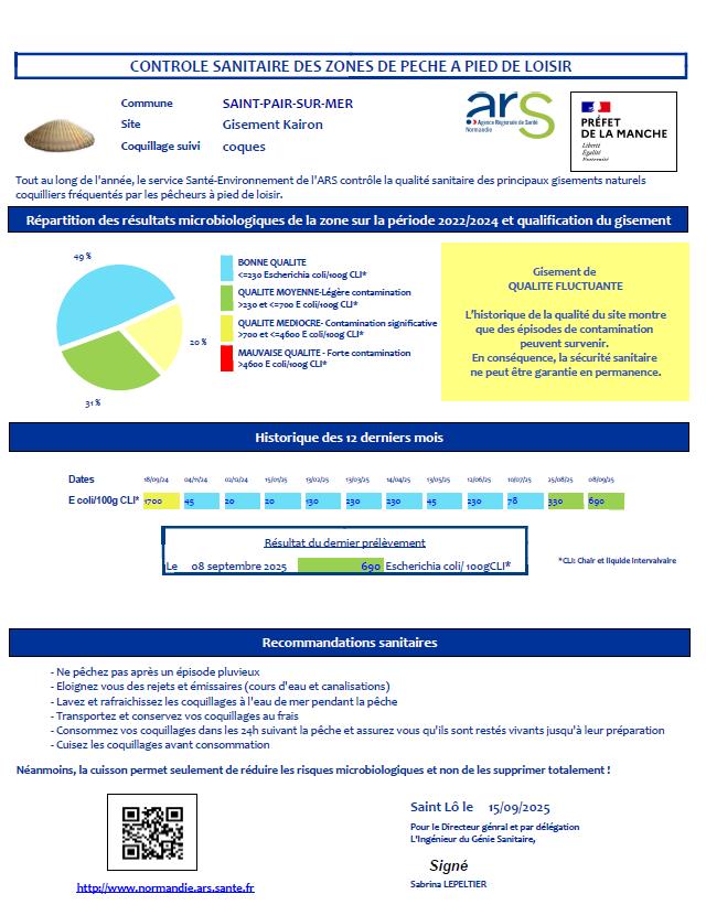 Zone de pêche à pied Etat des gisements naturels de coquillages Tout au long de l’année, le service Santé/Environnement de l’ARS contrôle la qualité sanitaire des principaux gisements naturels coquilliers.Suivis de la bactériologie, des métaux et de la radioactivité. Prélèvement du 08 septembre 2025 © aca Skip back to main navigation