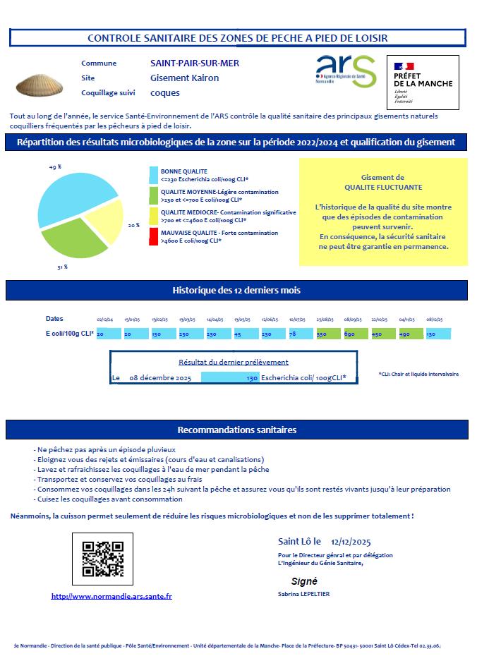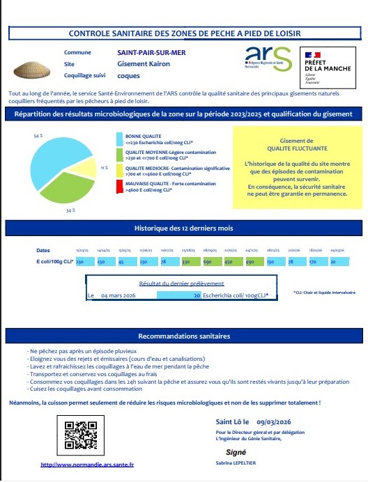 Zone de pêche à pied Etat des gisements naturels de coquillages Tout au long de l’année, le service Santé/Environnement de l’ARS contrôle la qualité sanitaire des principaux gisements naturels coquilliers.Suivis de la bactériologie, des métaux et de la radioactivité. Prélèvement du 08 décembre 2025 © aca Skip back to main navigation