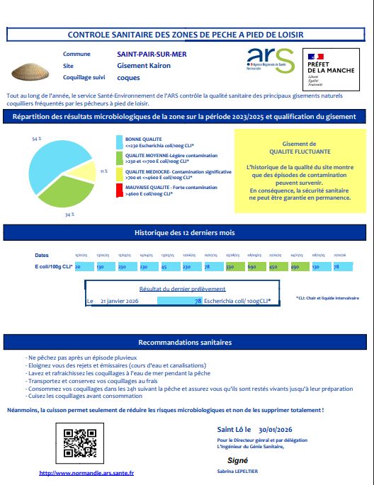 Zone de pêche à pied Etat des gisements naturels de coquillages Tout au long de l’année, le service Santé/Environnement de l’ARS contrôle la qualité sanitaire des principaux gisements naturels coquilliers.Suivis de la bactériologie, des métaux et de la radioactivité. Prélèvement du 21 janvier 2026 © aca Skip back to main navigation